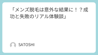 ■メンズ脱毛 「メンズ脱毛は意外な結果に!?成功と失敗のリアル体験談」 1. メンズ脱毛の新しい潮流最近、メンズ脱毛が新しいトレンドとして注目を集めています!従来は女性のための施術と考えられがちでしたが、今や男性たちも脱毛に目を向ける時代が到来しました。特に清潔感や見た目を重視する現代の男性にとって、脱毛は自分... 2025.02.26 ■メンズ脱毛